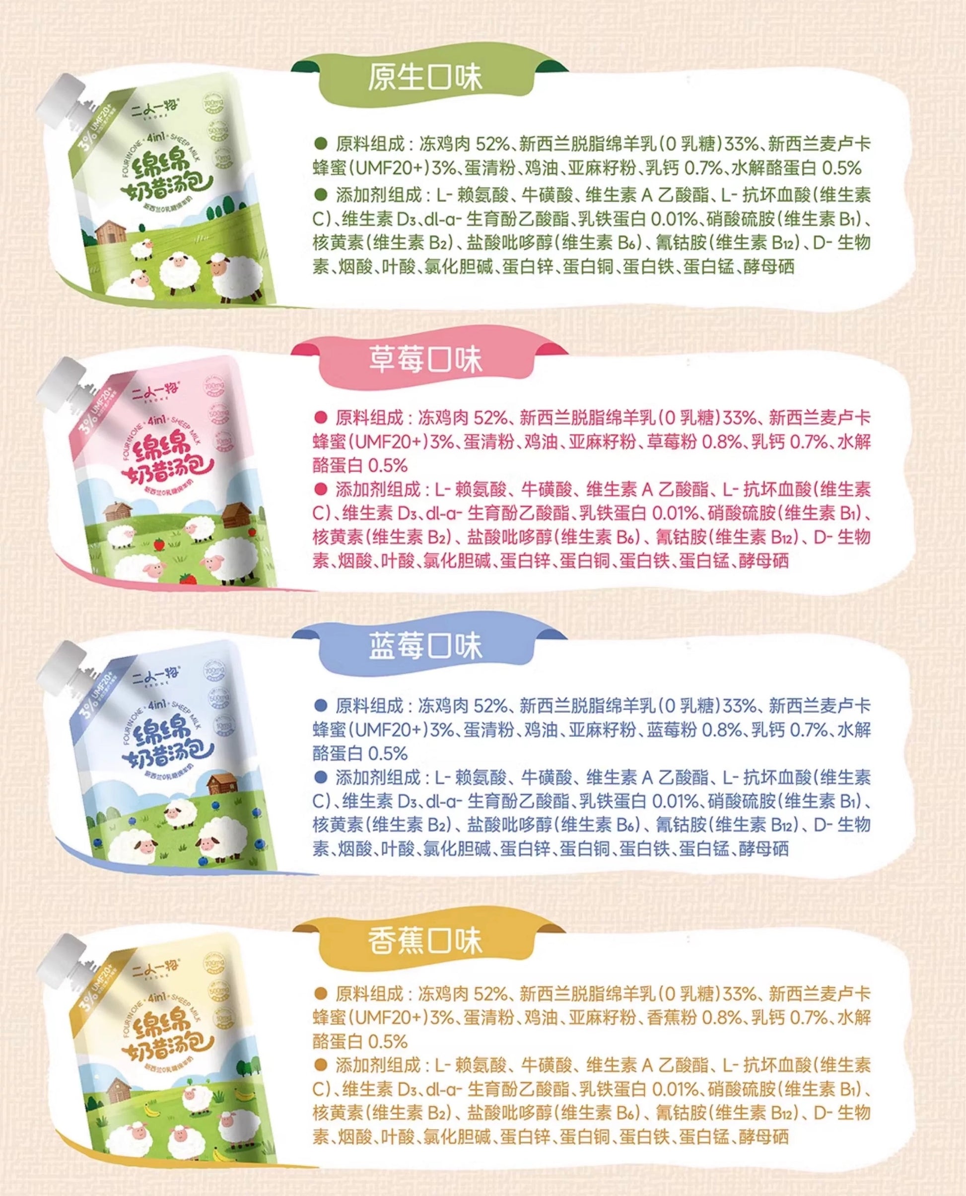Ingredients: 52% chicken, 33% goat milk, 3% Manuka honey (UMF20+), 3% egg white powder, chicken oil, flaxseed powder, 0.8% banana powder, 0.7% calcium milk, 0.5% hydrolyzed casein
