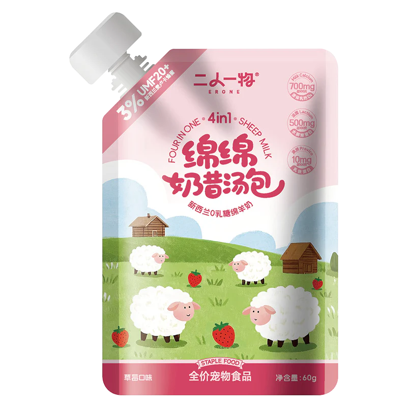 Ingredients: 52% chicken, 33% goat milk, 3% Manuka honey (UMF20+), 3% egg white powder, chicken oil, flaxseed powder, 0.8% strawberry powder, 0.7% calcium milk, 0.5% hydrolyzed casein