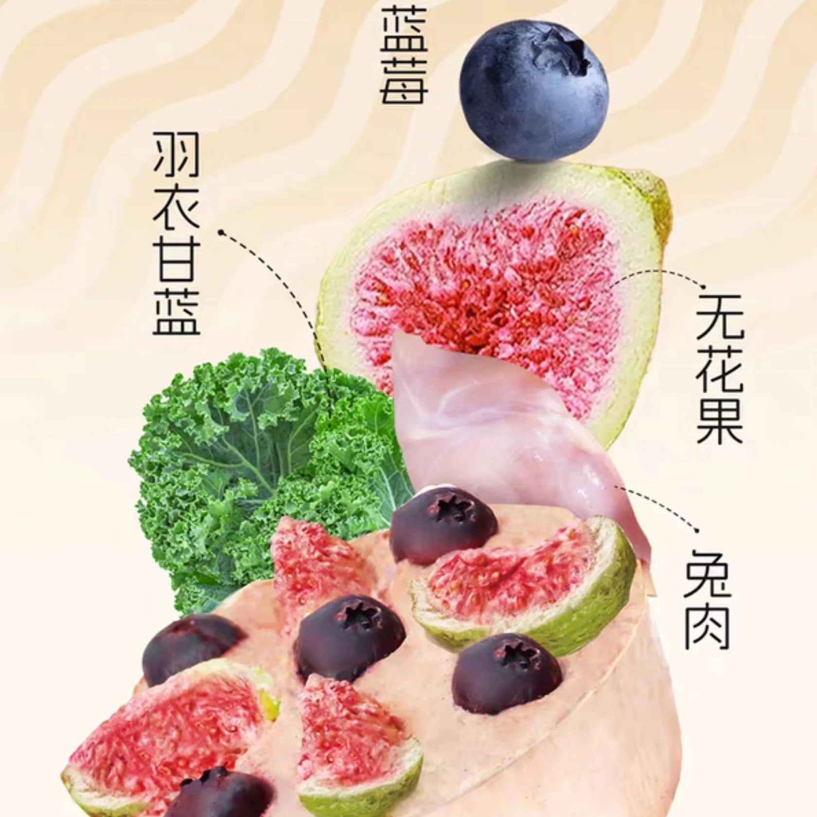 Ingredients: boneless rabbit meat 40%, chicken breast 35%, fig 10%, kale 10%, blueberry 5%
